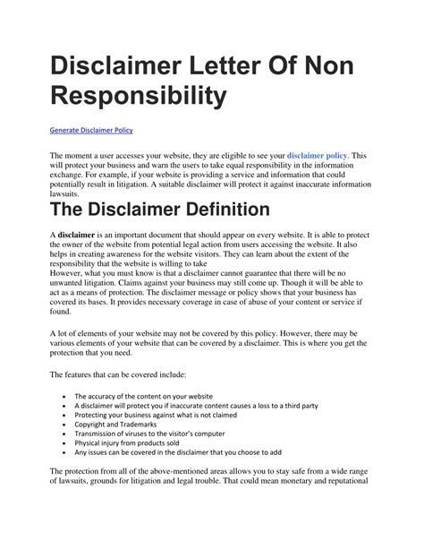 Free PDF Sample Disclaimer Letter Of Non Responsibility Paperback
